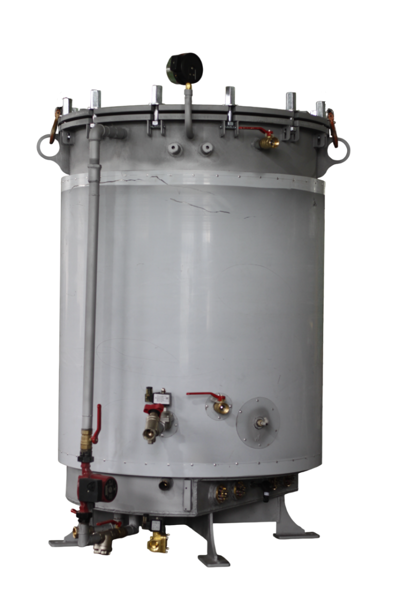 Нагрев обеспечивается подачей пара от внешнего источника во встроенный теплообменник (гофрированный змеевик D28) непосредственно в корпус автоклава. После завершения процесса стерилизации через змеевик, который расположен концентрично корпусу автоклава, прокачивается холодная вода, принудительно охлаждающая его внутренний объем без необходимости слива из него воды. Охлаждение проводится в автоматическом режиме. Время охлаждения с 120С до 80С составляет 8минут, с 120С до 40С - 16 минут.